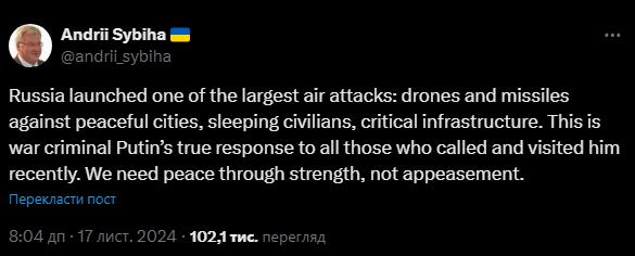 Масштабна атака РФ у неділю - це відповідь російського диктатора Володимира Путіна тим, хто нещодавно телефонував йому і відвідував. Про це 17 листопада заявив міністр закордонних справ України Андрій Сибіга в соцмережі X.
