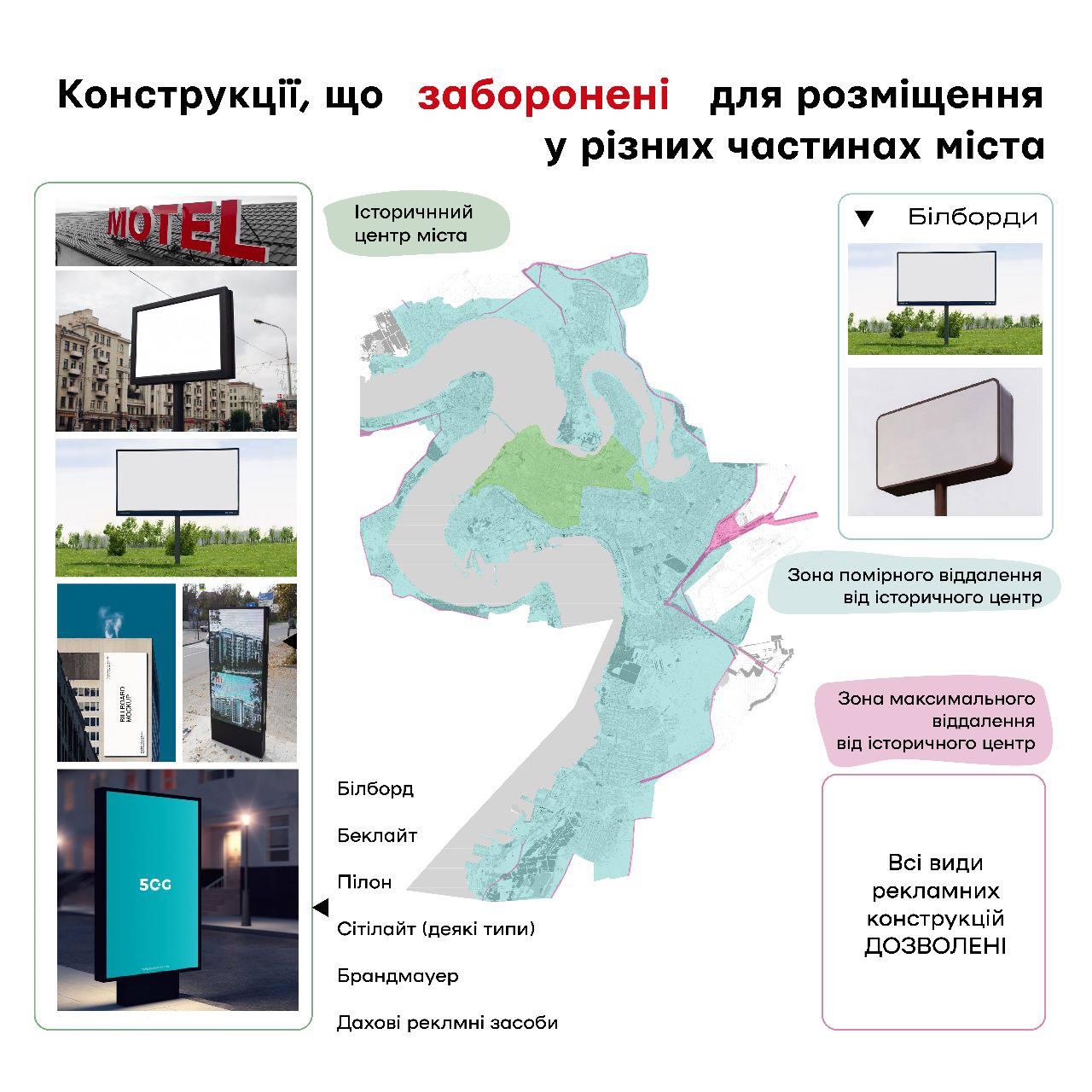 - задля досягнення візуальної одноманітності та уникнення видової та форматної невизначеності, по вулицях Маріупольській, Соборній та Героїв Рятувальників дозволено розміщення обмежені види стаціонарних рекламних конструкцій;