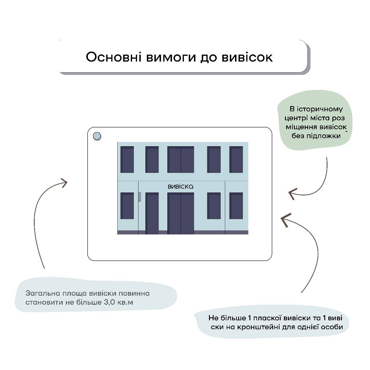 - вивіски не повинні перевищувати рекламну площу 3.0 м², повинні встановлюватися паралельно фасаду, не створювати перешкод для експлуатації та ремонту будинків, будівель або споруд, на яких вони розташовуються;