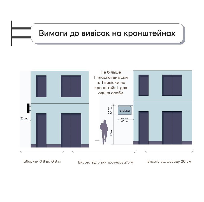 - розміри вивіски на кронштейні для зони А повинні бути не більше 80 × 80 см, для зони Б повинні бути не більше 130 × 80 см. Нижній край вивіски на кронштейні повинен розміщуватися на висоті не менше ніж 2,5 м від рівня мощення.