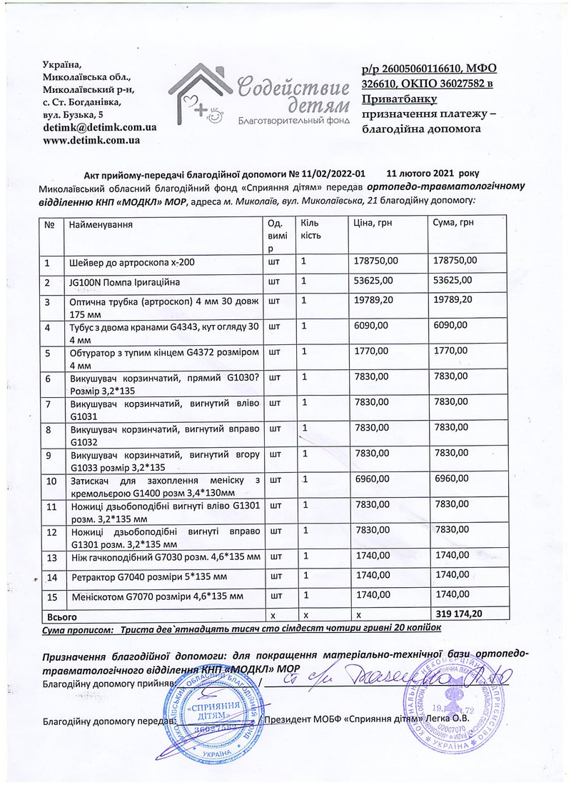 Благодаря собранной сумме на аукционе и помощи спонсоров удалось закупить: оборудование для артроскопической стойки на сумму 319 174,00 грн.