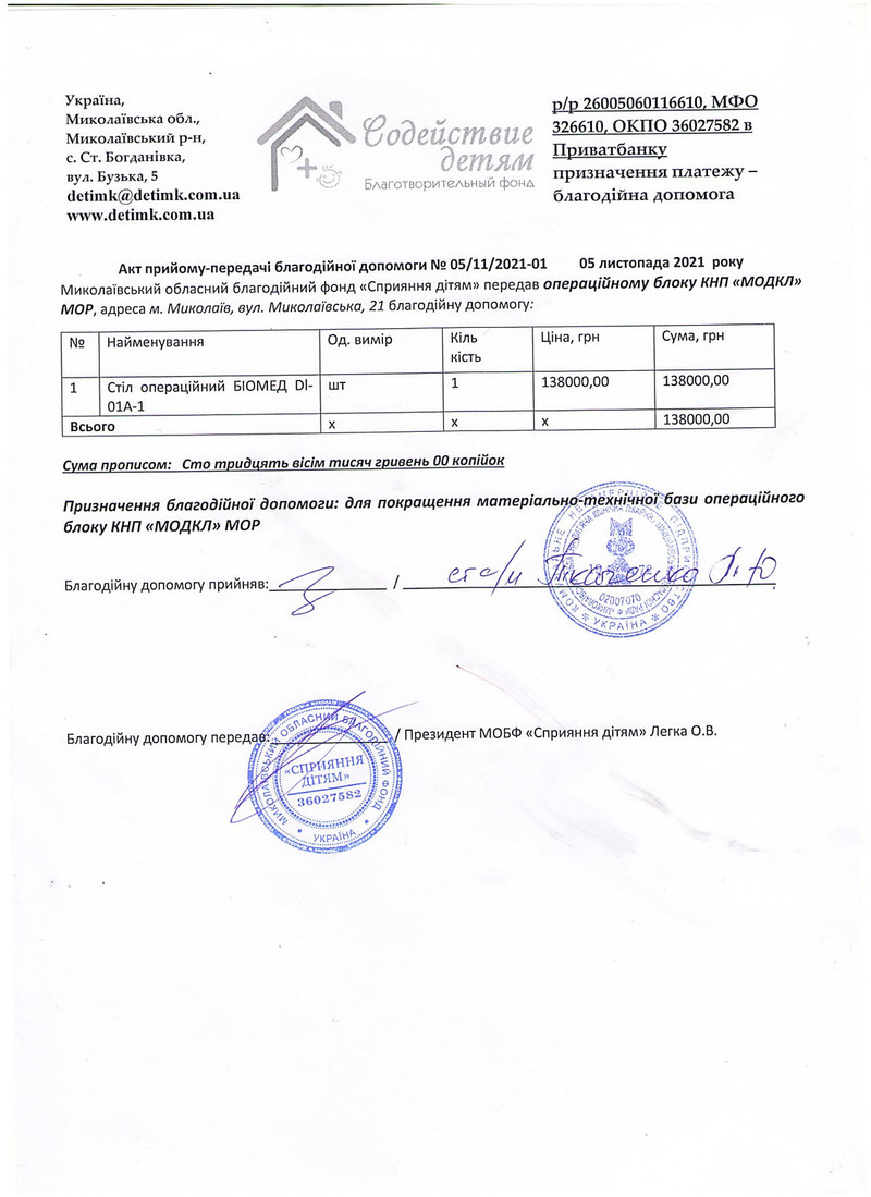 По словам основательницы фонда «Сприяння дітям», всего закуплено оборудования на общую сумму 484 674 грн.