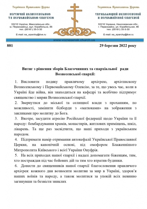 В Вознесенской епархии осудили агрессию РФ и поддержали намерение УПЦ получить автокефалию