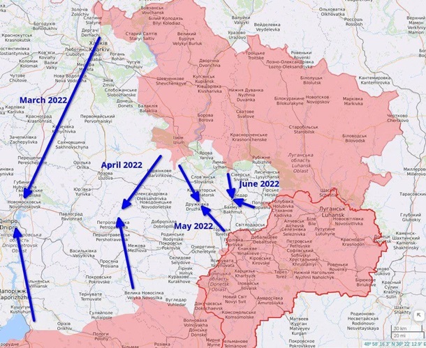 Еще в марте РФ мечтала окружить украинских солдат на востоке по линии Харьков-Днепр-Запорожье. К апрелю планы изменились на выход к административным границам Донецкой и Луганской области. В мае были попытки выйти на окружение Краматорска и Славянска, однако эти попытки также оказались безуспешны.