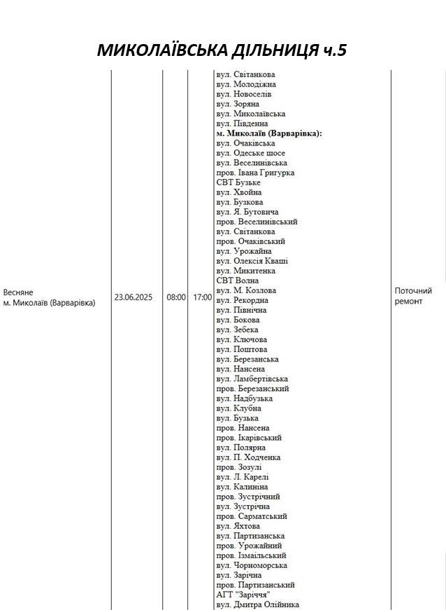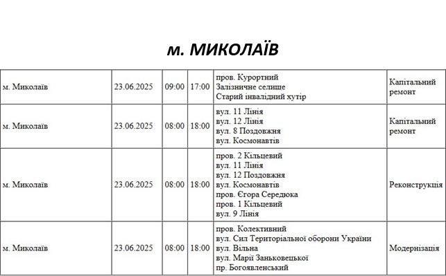 Внимание, Николаев! Некоторые улицы останутся без света 23 июня: больше всего отключений в Варваровке