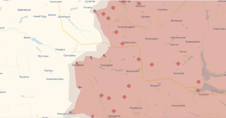 04:10 Російська окупаційна армія захопила місто Селидове Покровського району Донецької області, селище Вишневе та село Зоряне, а також просунувся біля Новоукраїнки, в Новодмитрівці та Курахівці. Про це повідомляє моніторинговий проєкт DeepState.