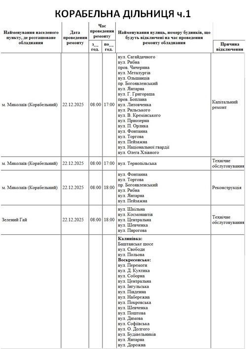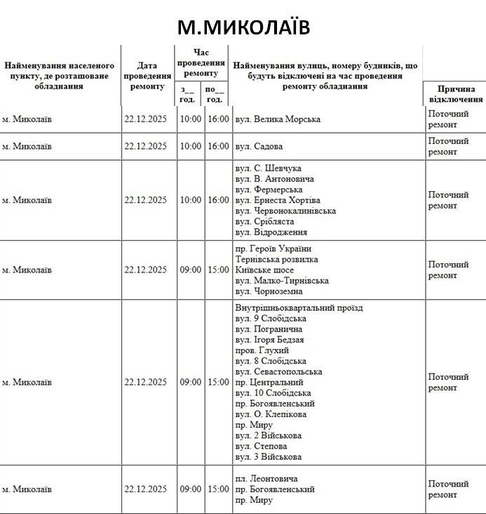 Внимание! 25 июня в Николаеве и области запланированы отключения света из-за ремонтных работ. Адреса