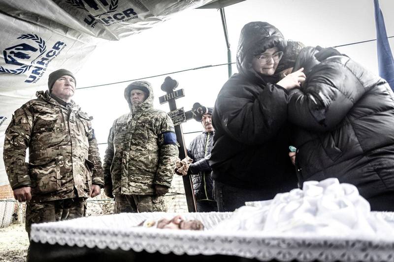 Іде крижаний дощ, від якого скорботних і покійного захищає навіс з брезенту, що був наданий Управлінням верховного комісара ООН у справах біженців після еокупації регіону.