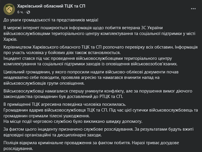 02:16 Полиция Харькова расследует уголовное производство по факту избиения мужчины в ТЦК и СП