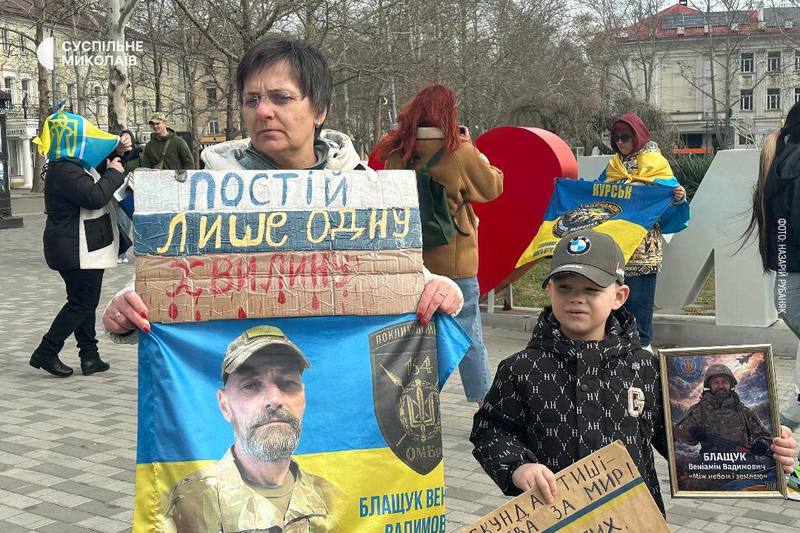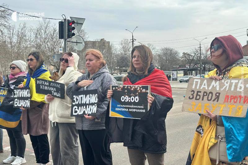 22 марта николаевцы собрались в центре города, чтобы почтить память украинцев, погибших в ходе полномасштабной войны. В 09:00 участники акции с фотографиями и плакатами почтили погибших минутой молчания.