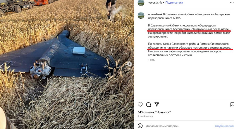 Що стало причиною такого інциденту, важко сказати, інформації не багато. Слов'янськ-на-Кубані знаходиться за більш ніж 300 км від лінії зіткнень у Запорізькій області. Тобто повстання Shahed-136 почалося буквально на старті, і вони просто не захотіли нікуди відлітати з Краснодарського краю, адже там так душевно, по-домашньому!