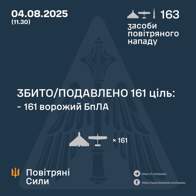 15:15 ПС ЗСУ відбили масований удар: Над Україною збито 161 ворожий дрон, нажаль є одне влучання
