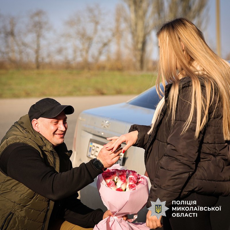Щоб здивувати Вікторію, Дмитро попросив колег з Баштанського райвідділу поліції інсценувати поблизу Нового Бугу зупинку їхнього автомобіля начебто для перевірки документів. Яким було здивування дівчини, коли її попросили підійти до багажника, де на неї чекав Дмитро з найважливішими словами. Під оплески поліцейських-інспекторів боєць почув омріяне «Так!».