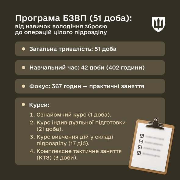 Тривалість БЗВП в ЗСУ складає 51 день. Безпосередньо на навчання відводиться 42 доби. Цей період охоплює: