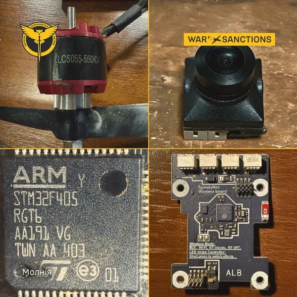 Хоча зовні дрон виглядає кустарно, його електроніка — це суміш компонентів з усього світу. Як повідомляє портал «Війна і санкції», у нутрощах «Молнії» знаходять деталі з Китаю (фірми FATJAY, SpeedyBee), мікросхеми зі Швейцарії (STMicroelectronics), а також запчастини виробництва США та Японії.