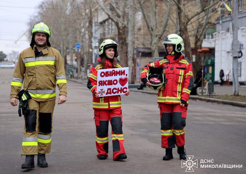 Напередодні Дня закоханих головна вулиця Миколаєва наповнилася особливою атмосферою. Поки в оперативних зведеннях панувала довгоочікувана тиша без пожеж, миколаївські рятувальники вирішили на мить відійти від суворих службових інструкцій. Співробітники ДСНС вийшли до містян із незвичним, але дуже щирим меседжем: «Якщо любиш ДСНС — обійми!».