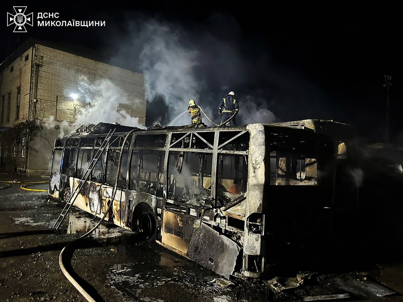 У місті Вознесенськ на території одного з транспортних об’єктів спалахнули пасажирські автобуси. Вогонь охопив 110 кв. м, у результаті чого згоріли чотири одиниці транспорту. Рятувальникам вдалося здійснити професійний маневр та захистити від знищення ще 6 поруч припаркованих автобусів. Попередня причина займання — коротке замикання електричного вузла.