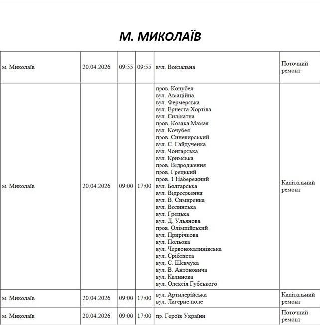 Увага! 20 квітня у Миколаєві та області заплановані відключення світла через ремонтні роботи. Адреси