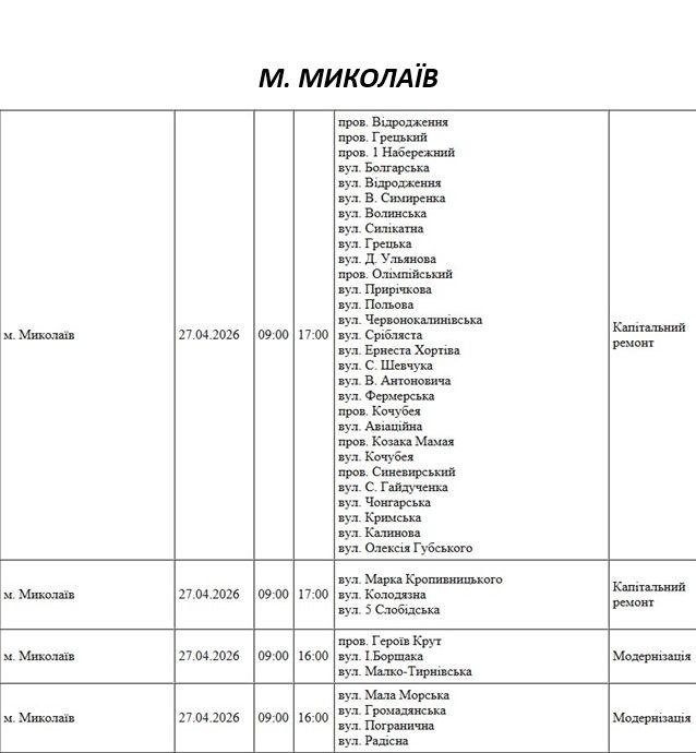 Увага! 27 квітня у Миколаєві та області заплановані відключення світла через ремонтні роботи. Адреси