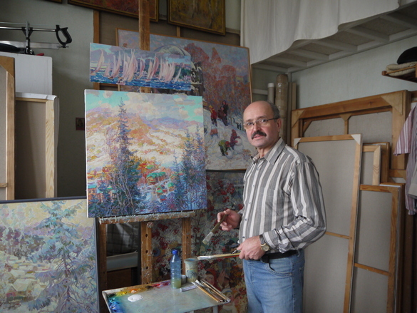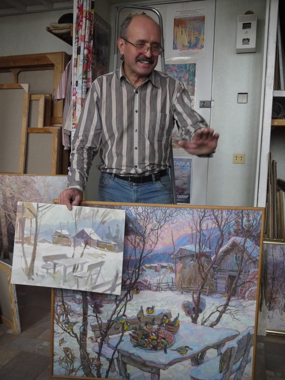 - Сказался период работы в художественно-конструкторском бюро ПО «Зоря», где занимался декоративной росписью в петриковском стиле и особенности одесской школы живописи, которые усвоил в художественном училище, в знаменитой «Грековке». Первый раз пошел на эксперимент в 2000 году. В пейзаже «Подмораживает» хотелось подчеркнуть изысканную графику оголенных деревьев на фоне зимнего пылающего неба. Процесс и результат одобрил народный художник Украины Михаил Алексеевич Ряснянский, который ценил в творчестве инициативу и смелость. В основу «Візерунків зими» лег этюд, написанный в Николаевском зоопарке. У нас обычно сиротские зимы, но бывают и «белые снеги». Они ненадолго, и надо успеть. Такой момент с зимними забавами у памятника корабелам запечатлен в сюжете «Дочекалися снігу».