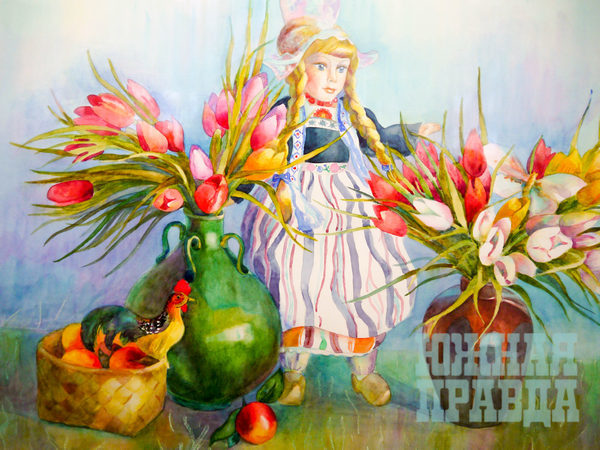 Татьяна Купцова – художник с богатейшим опытом, чья деятельность изначально была связана с графикой. В ее творческом багаже есть замечательные образцы рисунков, акварелей, офортов, литографий, создание которых – трудоемкий, длительный процесс. В современных условиях к ним обращаются немногие, поэтому к искусству такого уровня интерес особый. Для выставки отобраны работы из периода 80-х и новые. „Дождь в городе“ с необычным двухсюжетным композиционным построением разделяет людей, идущих под зонтом и тех, кому дано почувствовать, „услышать дыхание дождя через окно“. Аскетически краткий, почти абстрактный и медитативный „Пейзаж“ лишен конкретных изображений и рассчитан на эмоциональный отклик. Как говорится, чем меньше слов, тем шире круг ассоциаций. У каждого художника свой взгляд на мир, у каждого зрителя свои предпочтения. Кому необходимо что-то отчетливо видеть, могут насладиться ясностью пейзажа „Николаевский вечер“ Виктора Макушина. В нем простой провинциальный вид с одноэтажным домом, улицей, где старые деревья и буйство молодой зеленой листвы. Характерные приметы акварелей Ирины Кветки – звучность цвета и цветы, куклы и реальность, подобная сказке. Выглядят умилительно„Цветочные феи“, радуют „Весенние цветы“ и идеальна „Венеция“. Все сделано профессионально и находит отклик у любителей стиля, имеющего параллели с искусством наива – искренного и душевного.