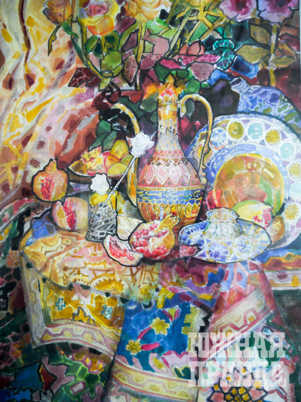Выставка наполнена контрастами и они подчеркивают устремленность авторов к индивидуальному самовыражению. У Дмитрия Болякова – известного реставратора, живописца и графика собственный путь и в разных творческих периодах есть очевидные достижения и ценные работы. На выставках прошлых лет мы встречались с „Ангелами“и любовались их великолепным декором. На смену евангелическим символам пришел интерес к предметам, их формам, фактуре и жанру натюрморта, у которого своя символика, положенная на реализм. „Восточный натюрморт“ и другие с цветами, плодами, вазами и тканями с богатым орнаментом захватывают роскошью, вызывают восхищение мозаикой и мерцанием цветных элементов, пластикой и выразительностью линий.