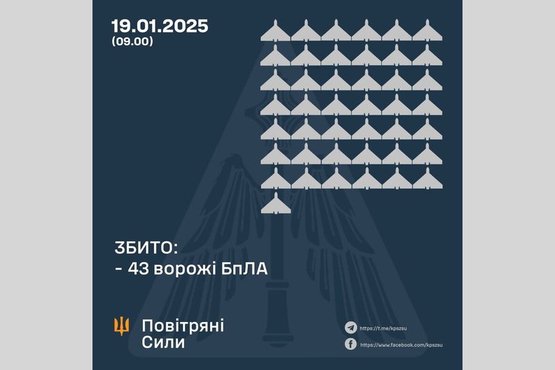 10:10 В небе над Украиной ночью сбили 43 из 61 БПЛА