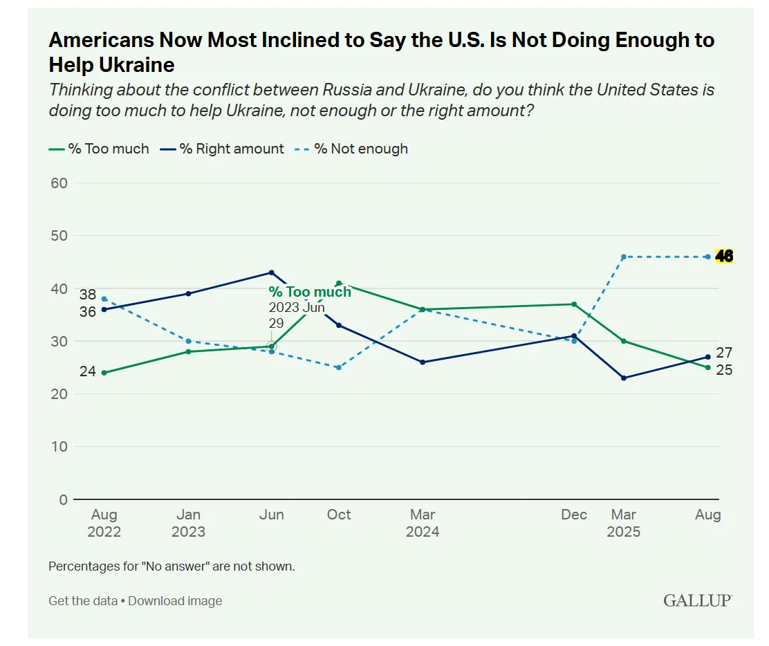 Опрос Gallup продолжался 1−15 августа, в частности до встречи президента США Дональда Трампа и российского диктатора Владимира Путина на Аляске.