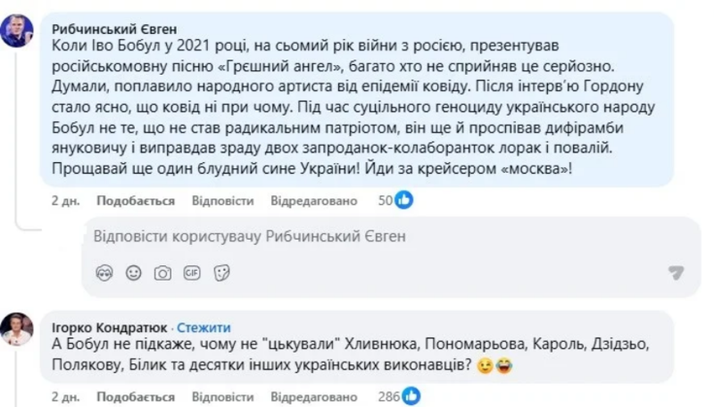 «Когда Иво Бобул в 2021 году, на седьмой год войны с Россией, презентовал русскоязычную песню Грешный ангел, многие не восприняли это всерьез. Думали, поплавило народного артиста от эпидемии ковида. После интервью Гордону стало ясно, что ковид ни при чем. Во время сплошного геноцида украинского народа Бобул не то, что не стал радикальным патриотом, он еще и пропел дифирамбы Януковичу и оправдал измену двух запроданок-коллаборанток лорак и повалий. Прощай, еще один блудный сын Украины! Иди за крейсером „москва“», — прокомментировал Евгений Рыбчинский.