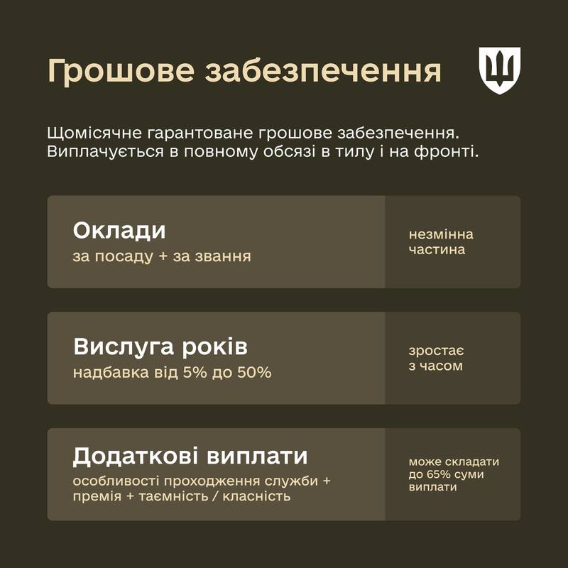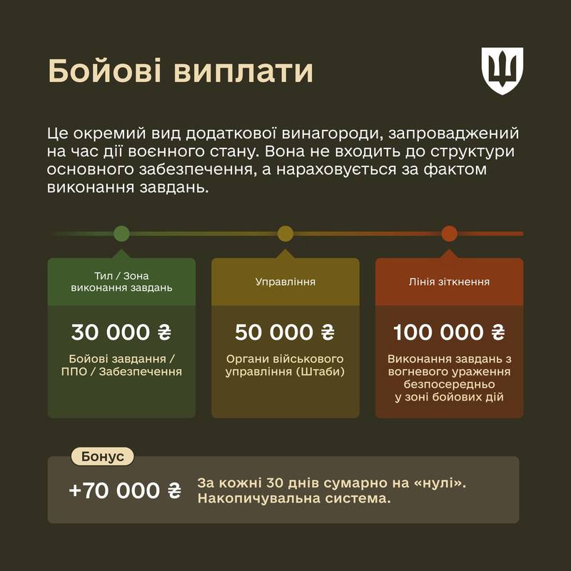 Важливо: Також діє виплата у розмірі 70 000 грн — одноразова винагорода за кожні сумарно обчислені 30 днів (місяць) виконання бойових завдань безпосередньо на лінії зіткнення (на «нулі») або на території противника.