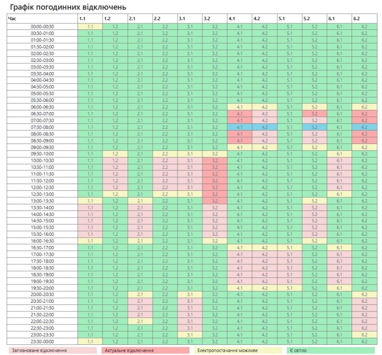 3.2 – 00:00 - 00:30; 09:00 - 12:30; 19:30 - 21:30 (Всего 6 часов без света).