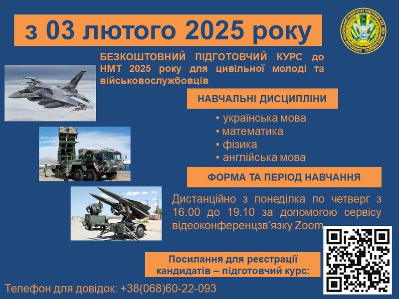 Харківський національний університет Повітряних Сил імені Івана Кожедуба (ХНУПС) оголошує про безплатний підготовчий курс для вступників до своїх лав.