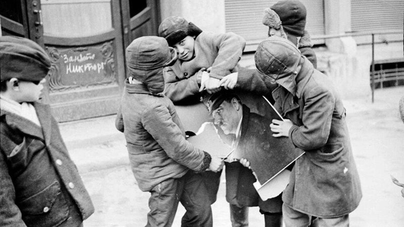 Діти звільненого міста Миколаїв рвуть плакат із зображенням Адольфа Гітлера
