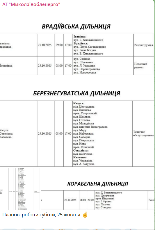 У суботу, 25 жовтня, мешканцям Корабельного району Миколаєва, Врадіївської та Березнегуватської громад слід бути готовими до тимчасових відключень електроенергії. За інформацією «Миколаївобленерго», це пов'язано із проведенням планових ремонтних робіт на електромережах.