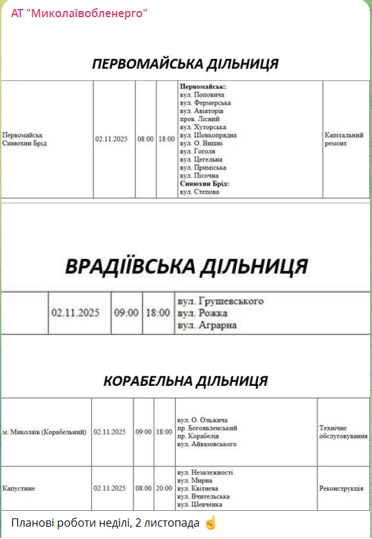 У неділю, 2 листопада, мешканцям Миколаєва та області слід бути готовими до тимчасових відключень електроенергії. За інформацією «Миколаївобленерго», це пов'язано із проведенням планових ремонтних робіт на електромережах.