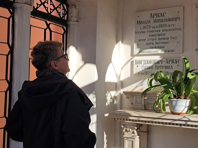 Письменниця підкреслила, що саме в Миколаєві "найнаочніше видно, як нинішня війна деколонізує Україну", збиваючи двохсотлітні нашарування імперського міфу. Хоча до повного вивільнення "козацького міфа" справа ще не дійшла (пам'ятник Миколі Аркасу, обіцяний місту, досі не стоїть), Забужко разом із супутниками з'їздила на цвинтар покласти квіти на могилу Аркаса, чий родинний склеп, на щастя, зберігся.