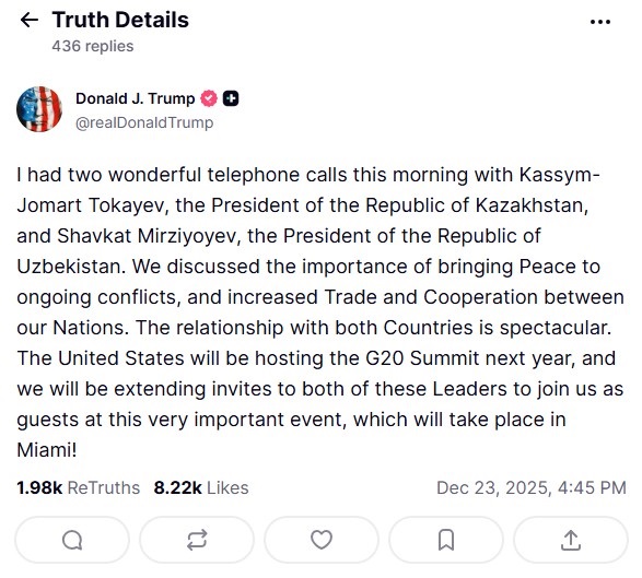 Президент США Дональд Трамп вирішив покликати лідерів Казахстану та Узбекистану на саміт Великої двадцятки (G20) наступного року.