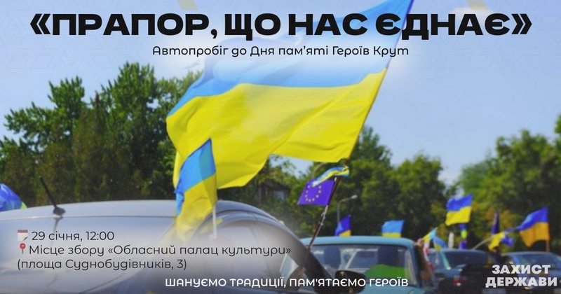 У Миколаєві 29 січня 2026 року Миколаївський районний осередок громадської організації «Захист Держави» проведе автопробіг до Дня пам’яті Героїв Крут під символічною назвою «Прапор, що єднає».