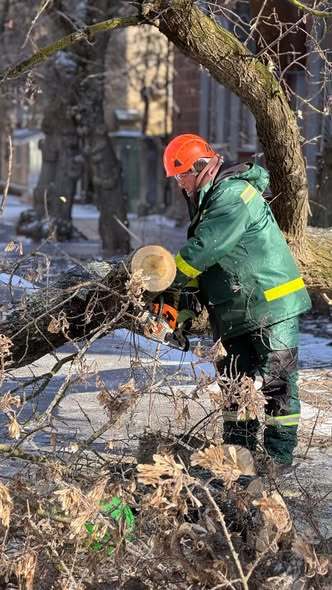 Погода у місті досі нестабільна: фіксуються пориви вітру, а дерева залишаються вкритими шаром льоду, що підвищує ризик їхнього падіння. Паралельно з ліквідацією аварійних дерев, працівники щодня прибирають сніг та посипають пішохідні зони протиожеледними сумішами.