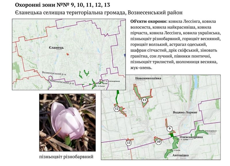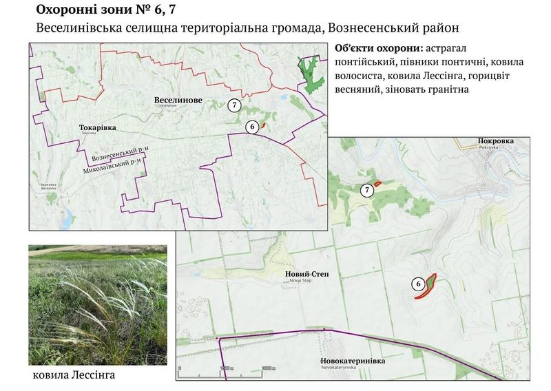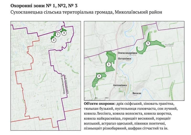 Нові природоохоронні ділянки розташовані у шести територіальних громадах: Єланецькій, де створено п'ять зон, Сухоєланецькій із трьома зонами, Веселинівській із двома, а також по одній зоні у Нечаянській, Ольшанській та Степівській громадах. Здебільшого ці комунальні землі знаходяться в балках та на крутих річкових схилах. Такий рельєф унеможливлює їхнє розорювання, що є критично важливим для екології, проте місцевим жителям дозволяється продовжувати традиційну господарську діяльність, зокрема сінокосіння та випасання худоби.