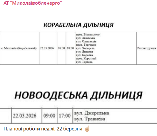 У неділю, 22 березня, мешканцям двох дільниць електромереж Миколаївщини слід бути готовими до тимчасових відключень електроенергії - Корабельної та Новоодеської. За інформацією «Миколаївобленерго», це пов'язано із проведенням планових ремонтних робіт на електромережах.