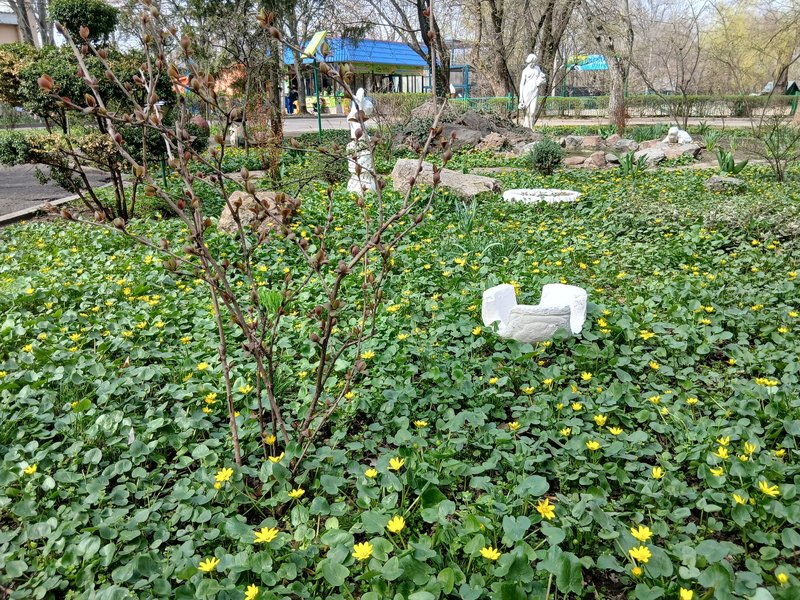 Окрім дерев, на зелених газонах зоопарку з'явилися перші нарциси та тюльпани. Поміж трави також розцвіли пшінка весняна, гусяча цибулька, глуха кропива, барвінок та фіалки. У зоопарку підкреслюють, що така різноманітність створює ніжну та яскраву красу, якою можна насолодитися, не виїжджаючи далеко за межі міста.