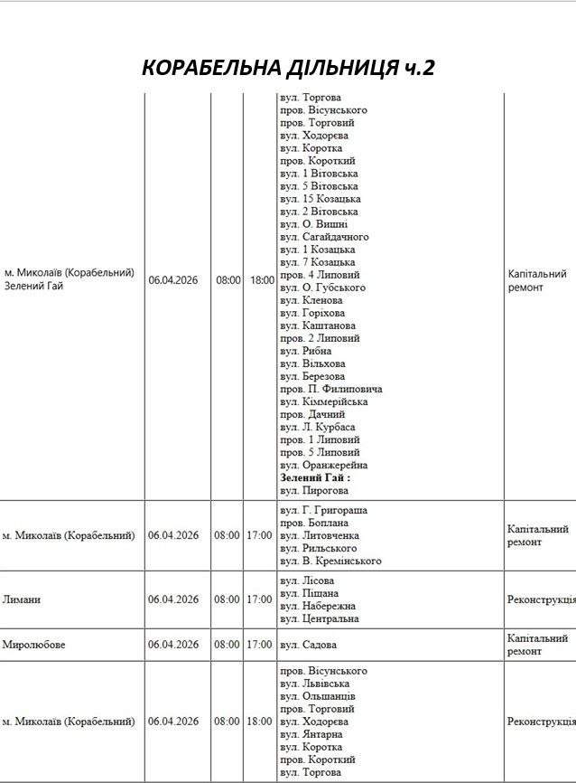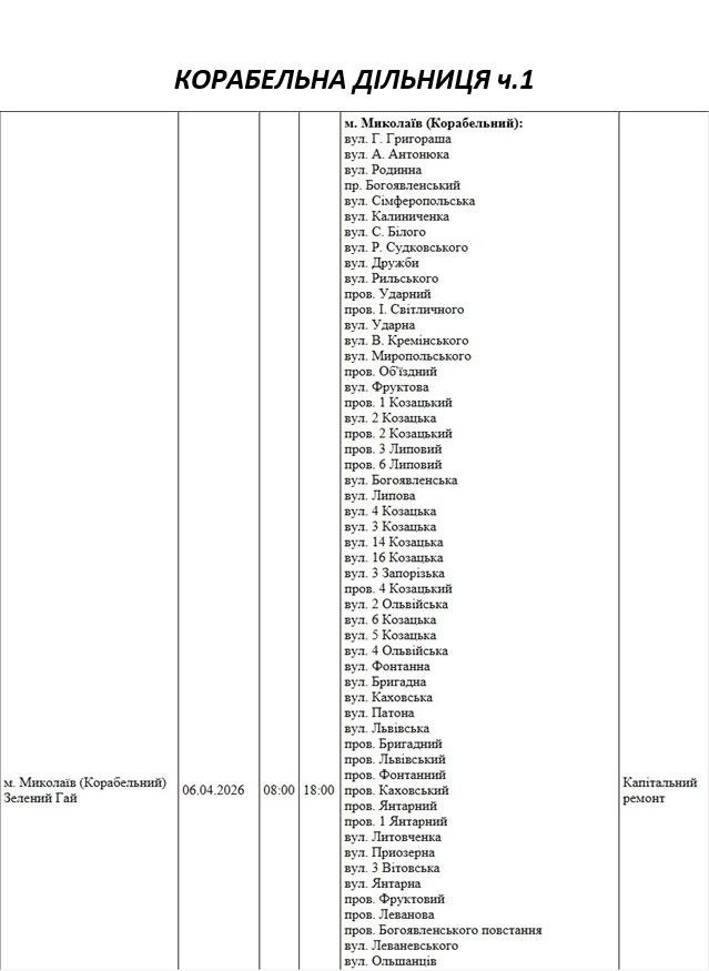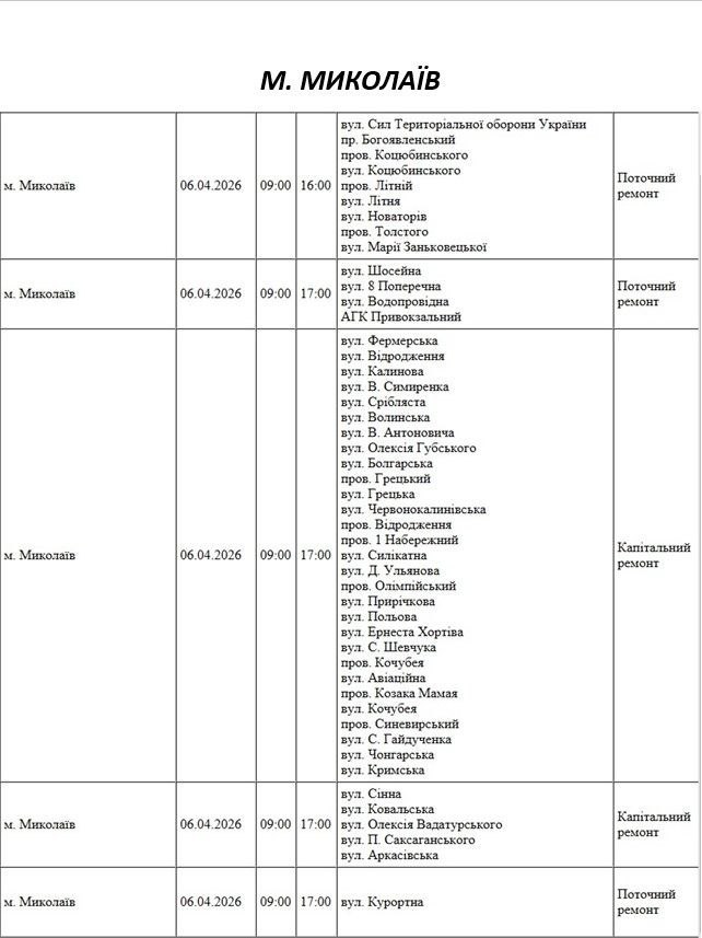 Увага! 6 квітня у Миколаєві та області заплановані відключення світла через ремонтні роботи. Адреси