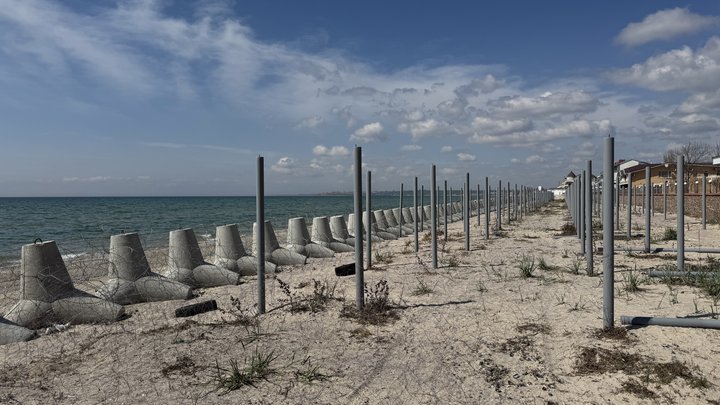 на піщаному березі перед бетонними конструкціями закладені протипіхотні мінні загородження.