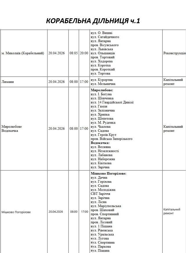Увага! 20 квітня у Миколаєві та області заплановані відключення світла через ремонтні роботи. Адреси
