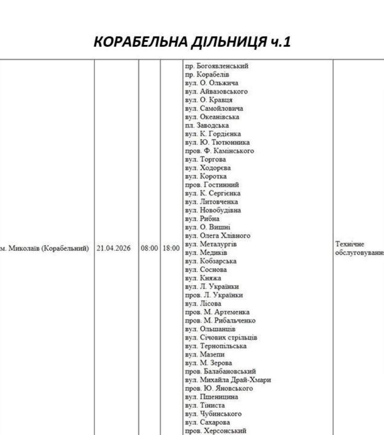 Увага! 21 квітня у Миколаєві та області заплановані відключення світла через ремонтні роботи. Адреси