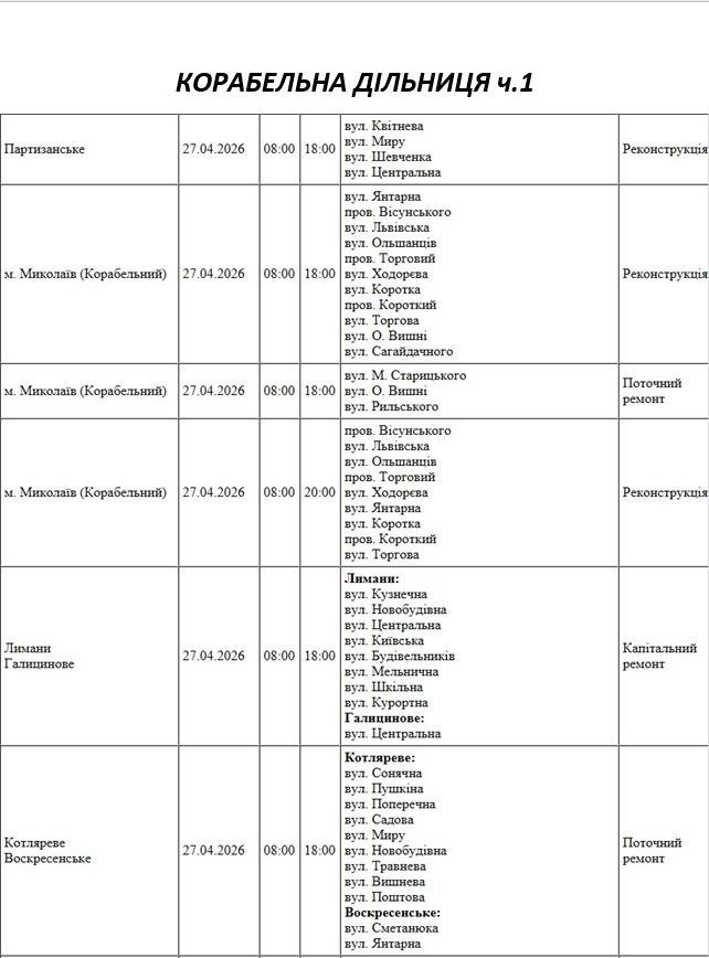Увага! 27 квітня у Миколаєві та області заплановані відключення світла через ремонтні роботи. Адреси