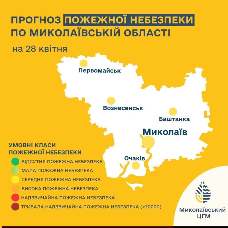 Прогноз пожежної небезпеки на 28 квітня 2026 року за даними Миколаївського обласного гідрометцентру: